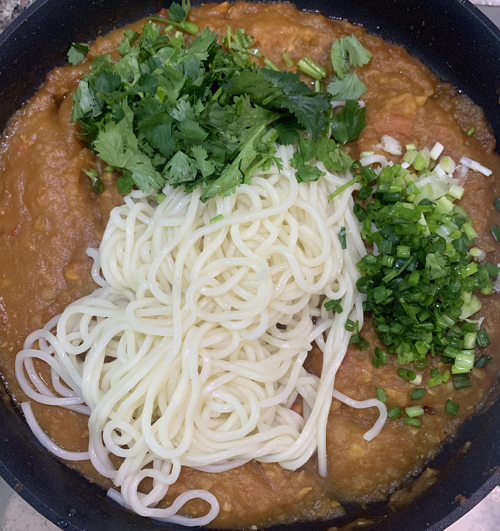 Step 4: Finally, add the cooked noodles, green onion, and cilantro to the pan. Mix everything well. Now you can enjoy your delicious mashed potato noodles!